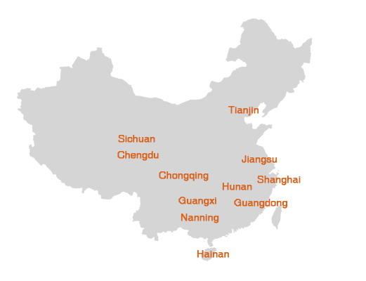 ?Nanning, Guangxi; Tianjin; Chongqing; Guangdong; Chengdu, Sichuan; Hunan; Hainan, Jiangsu and Shanghai