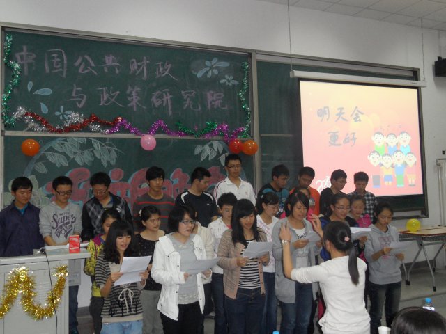 2011年10月12日晚,中国公共财政与政策研究院大一大二全体同学在主教109隆重举行了2011届迎新晚会。党总支书记侯聪惠,辅导员朱少波,和部分大三、大四同学前来捧场。